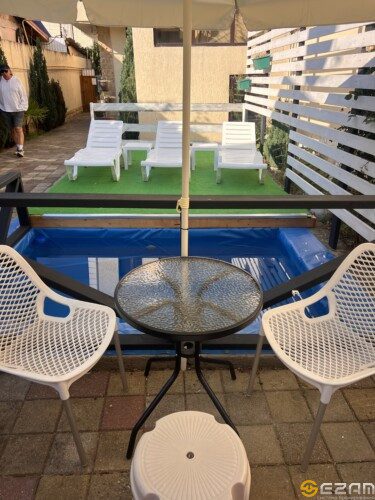 Вид из окон во дворик и на улицу. Планировка в виде евродвушки. Спальные места: два дивана-кровати на 4 спальных места.
