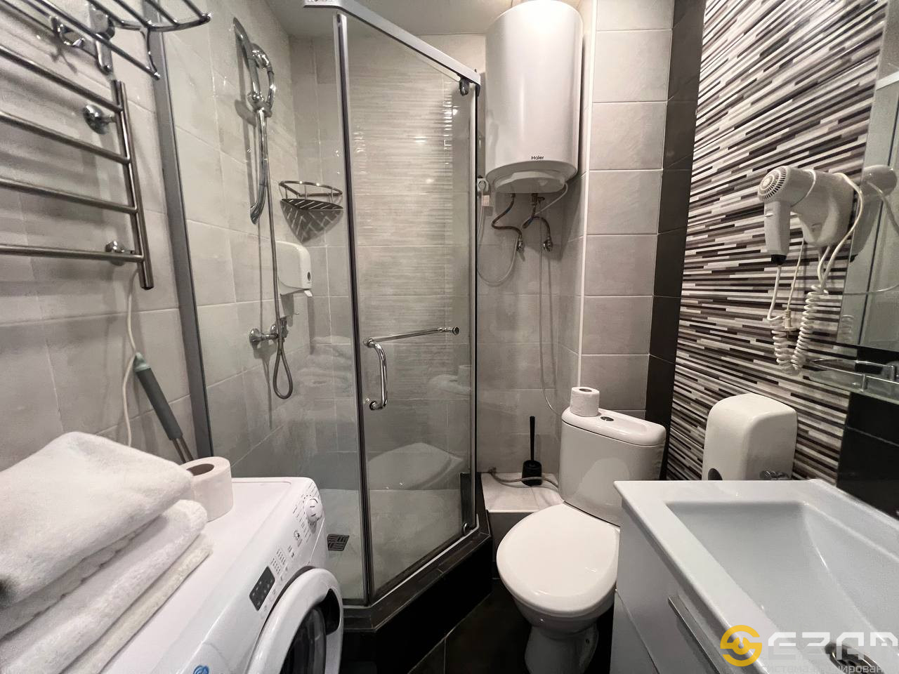 Квартира оборудована всем необходимым для комфортного проживания: сплит-система, тёплый пол, ЖК телевизор, фен, утюг, стиральная машинка и т. д.