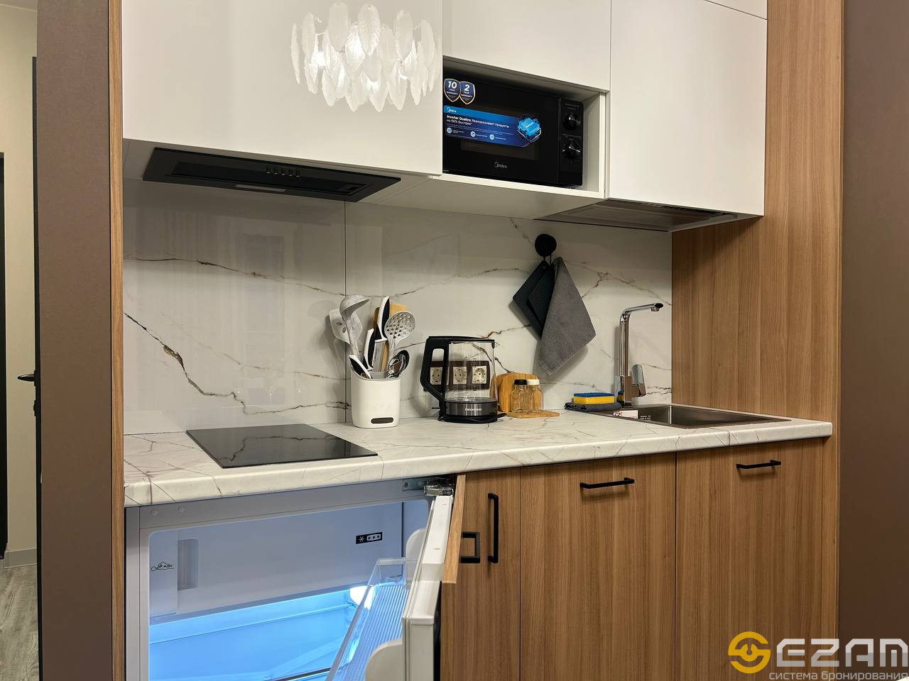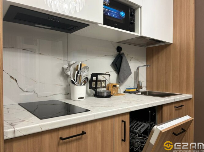 ✔ Кондиционер (сплит-система), стиральная машина, холодильник, варочная панель, микроволновка, чайник, фен, сушилка для белья.